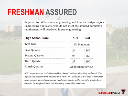 Applicants who do not meet assured admission criteria will have their records reviewed in order to evaluate other factors that could predict success at Texas Tech University.