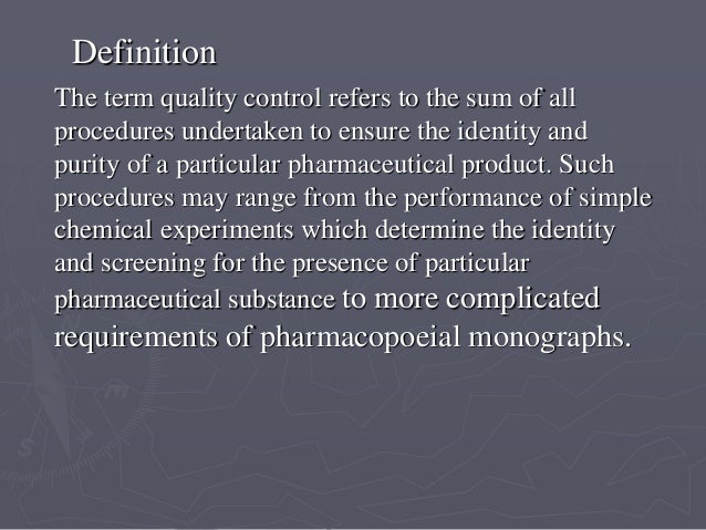 Table 12-1 reviews common terms associated with the quality assurance process that you may hear in your pharmacy. Quality control can be defined as part of quality management focused on fulfilling quality requirements While quality assurance relates to how a process is performed or how a product is made quality control is more the inspection aspect of quality management. 1Drug and narcotic control standards 2Drug industry standards.